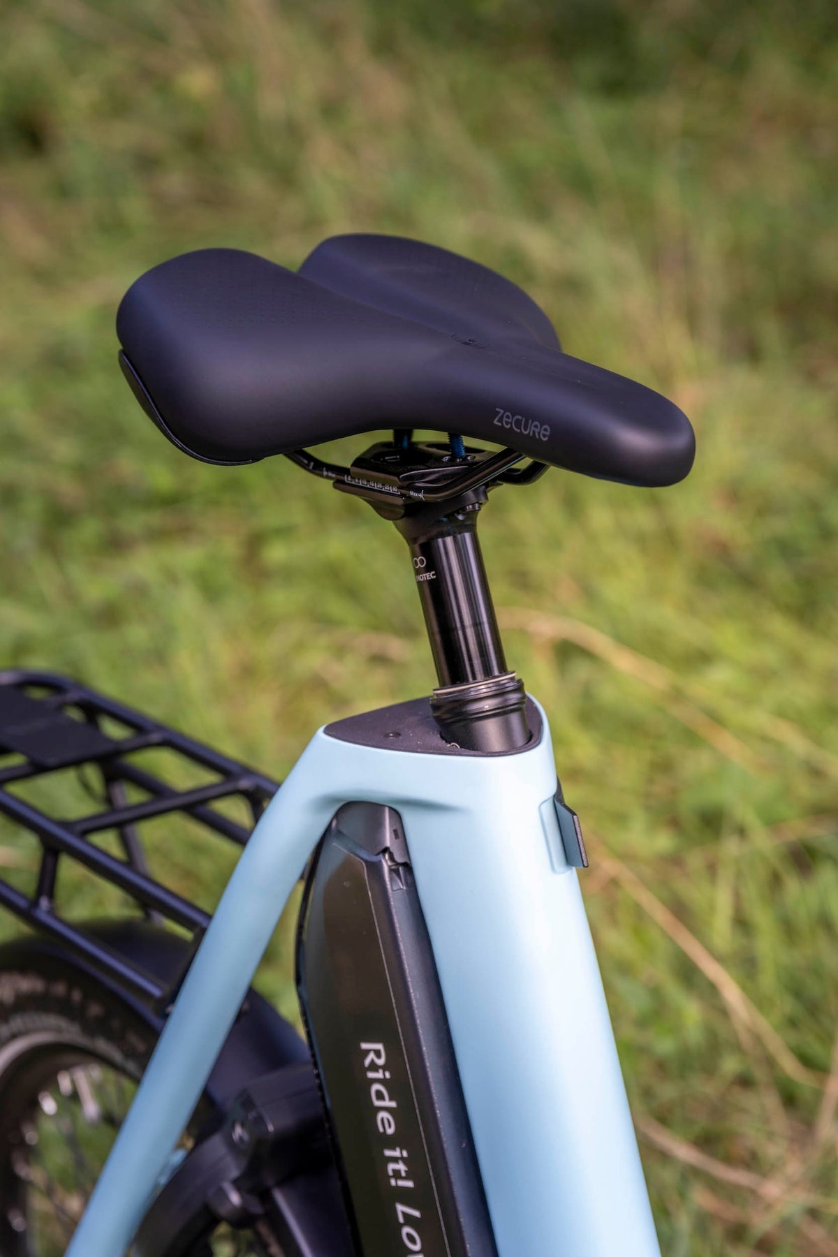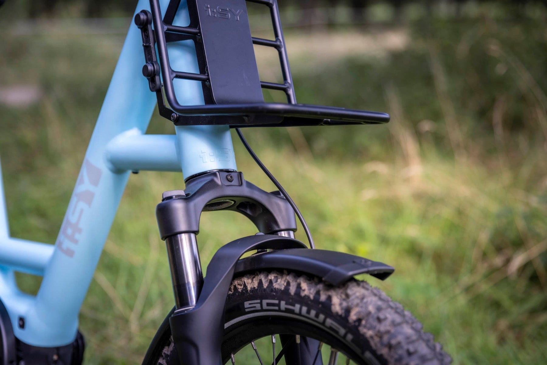 Komfortabel und geländegängig in einem? Mit unserem i:SY E5 ZR F CX geht alles. Dank Grobstollenreifen und Federgabel ist man ohne Rutschen und Handgelenkschmerzen im Gelände unterwegs. Unsere neue Suspension Dropper Seatpost - gefederte, absenkbare Sattelstütze - ist nicht nur für Downhill-Fahrten interessant. Die Absenkfunktion, per Knopfdruck am Lenker gesteuert, lässt den Sattel um 40 mm sinken. Besonders praktisch, wenn man noch bequemer auf- und absteigen möchte, bspw. an einer roten Ampel. Der ebenfalls 40 mm lange Federweg macht das Fahren noch komfortabler. In Kombination mit dem richtigen Luftdruck erhält man eine angenehme Federung, die vor allem auf Kopfsteinpflaster und wurzeligen Waldwegen zur Geltung kommt.