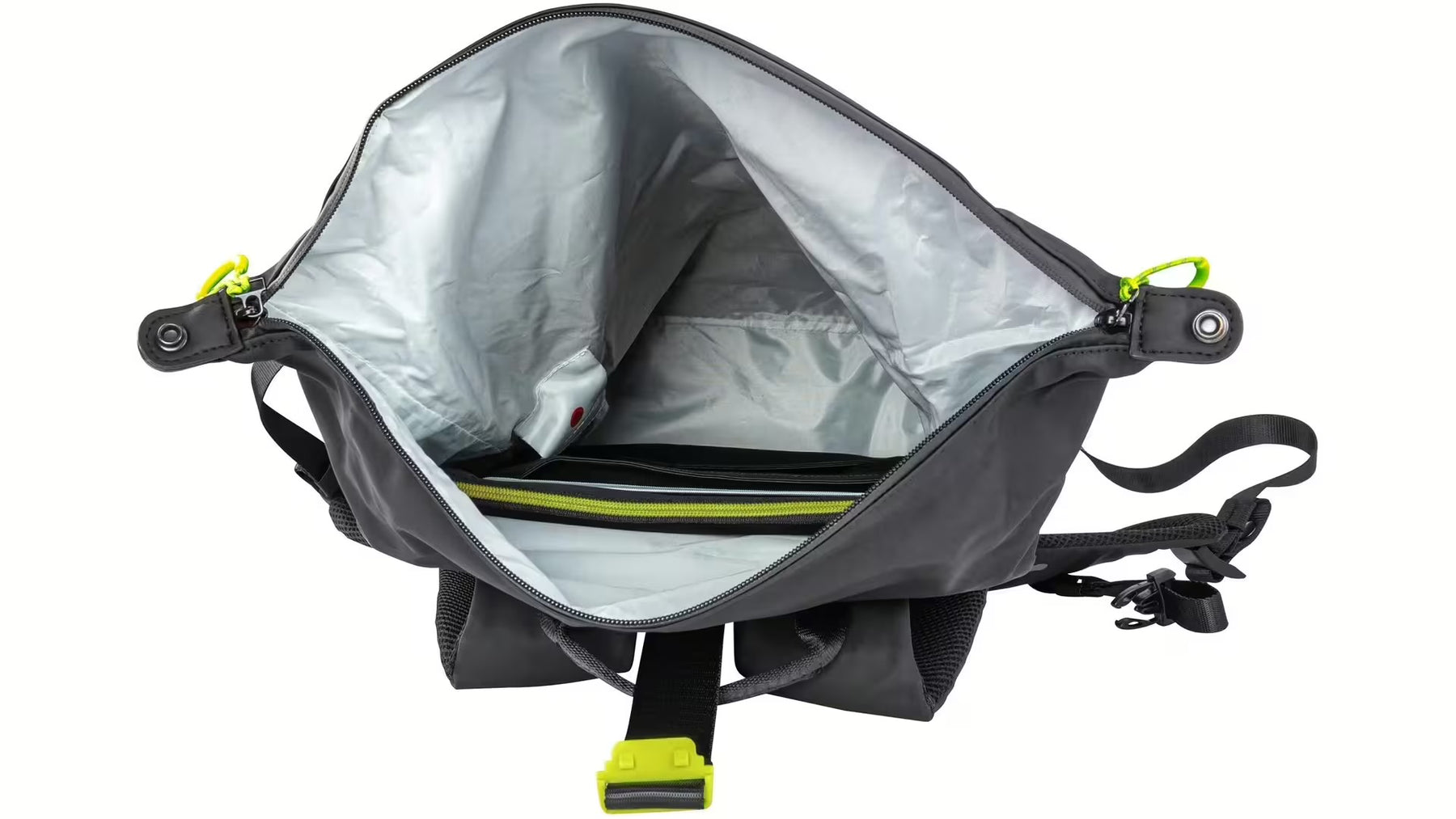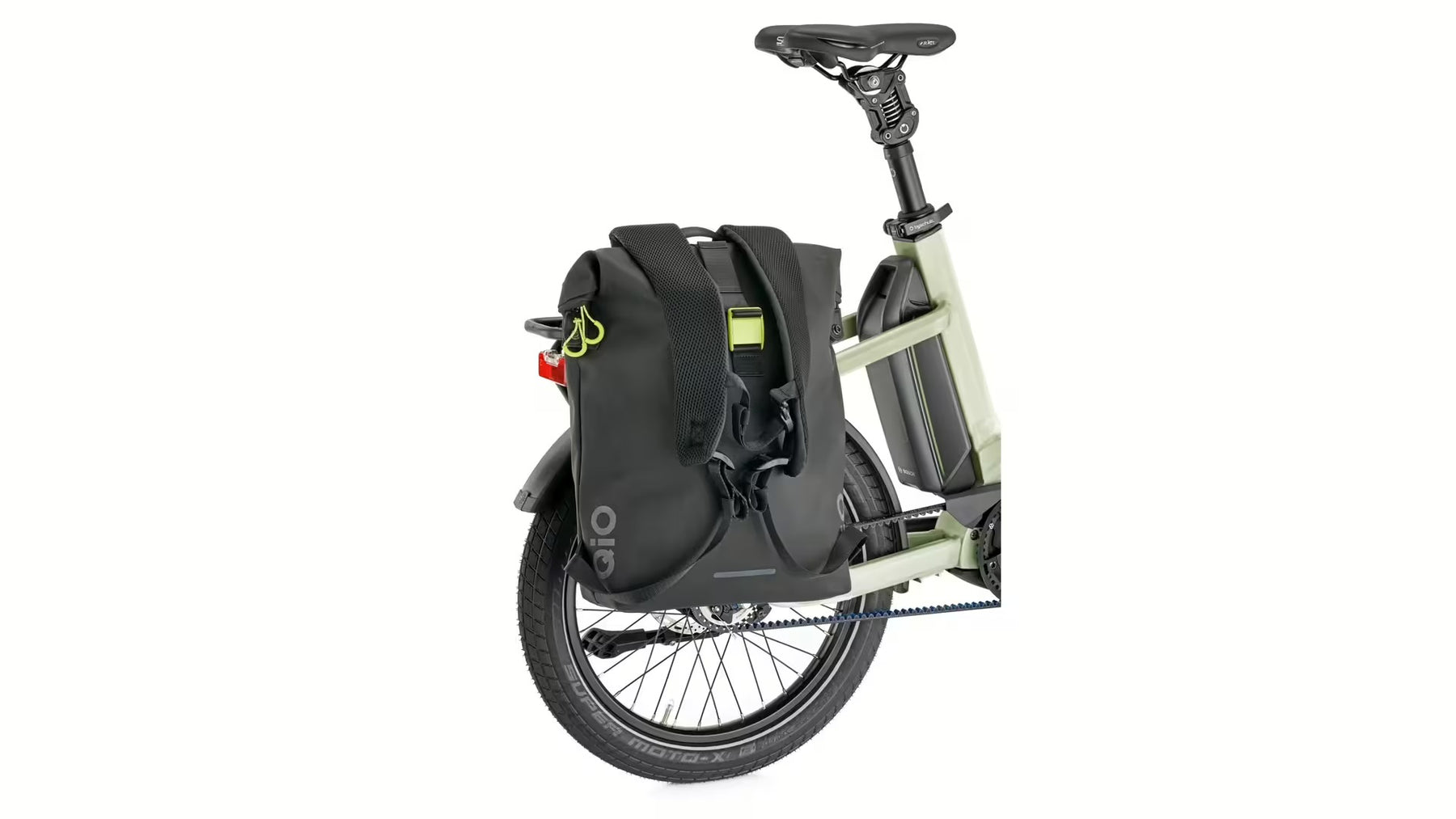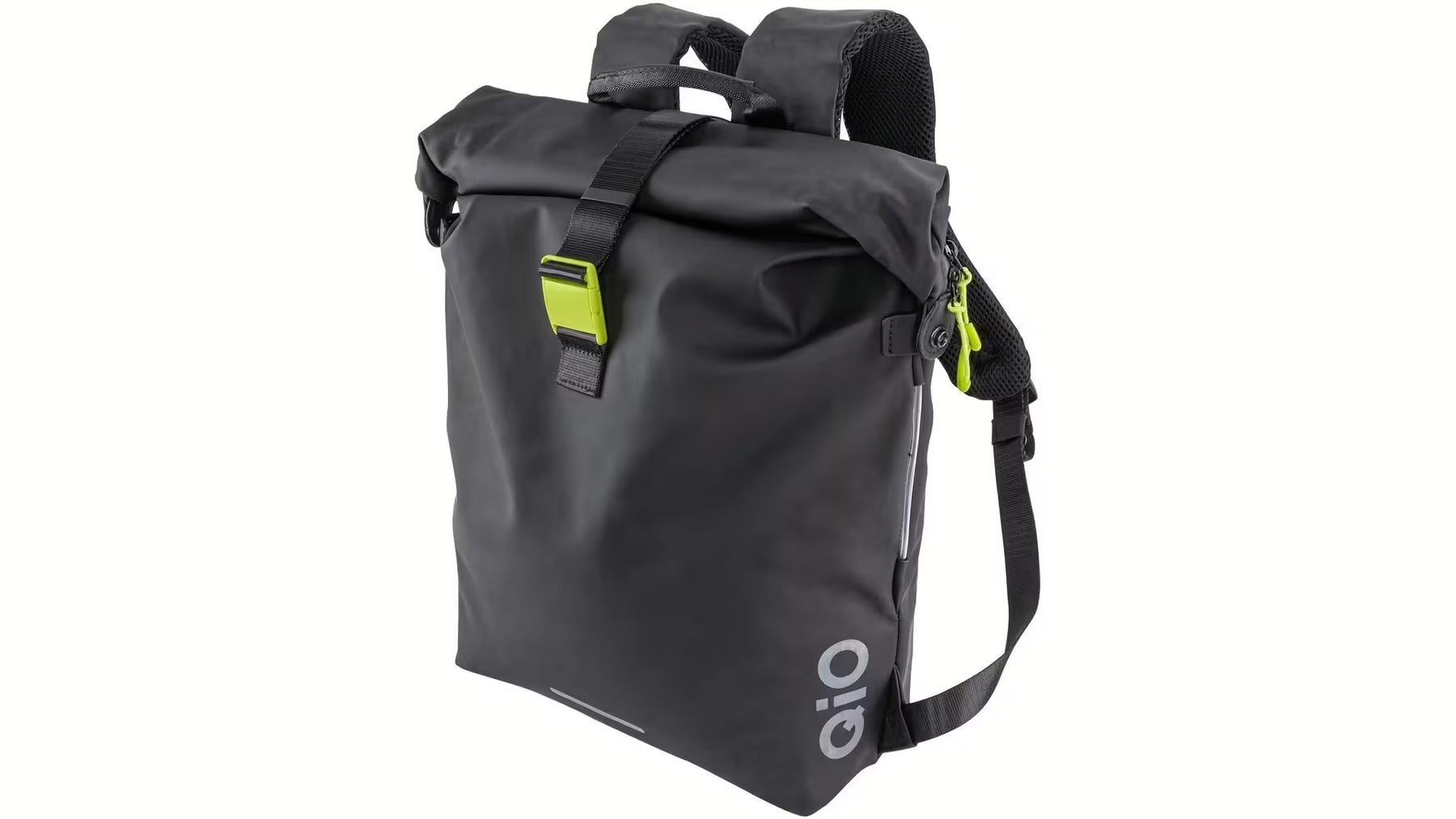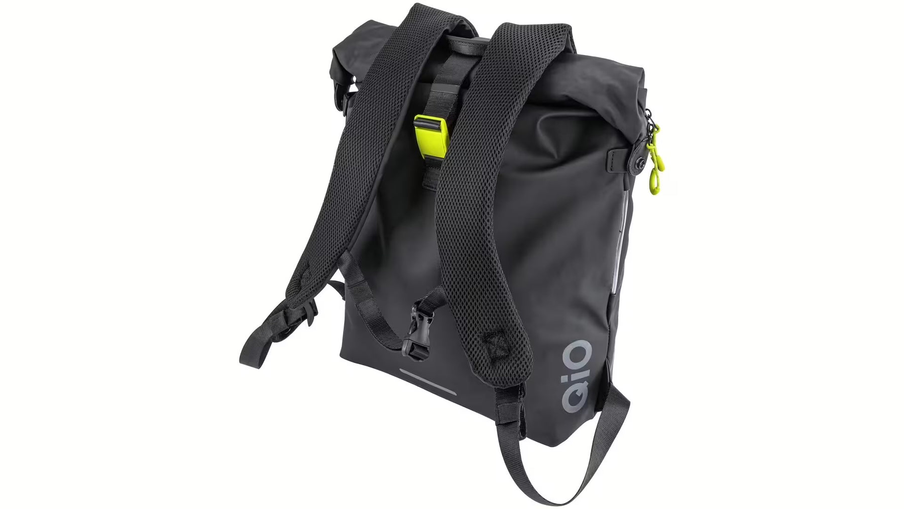 Der 17-Liter-Rucksack „Mika“ von QiO ist ideal für Alltag und Freizeit. Er bietet ausreichend Platz für Arbeitsunterlagen, verfügt über einen herausnehmbaren Neopren-Organizer für den Laptop und eignet sich dank Rolltop auch für Snacks und Getränke. Das wasserdichte PU-Material (IPX3) schützt bei Regen, während Reflektoren und ein integriertes LED-Licht die Sichtbarkeit erhöhen. Gepolsterte Schultergurte sorgen für Tragekomfort, alternativ lässt sich „Mika“ per Hook-on-System am Gepäckträger befestigen.